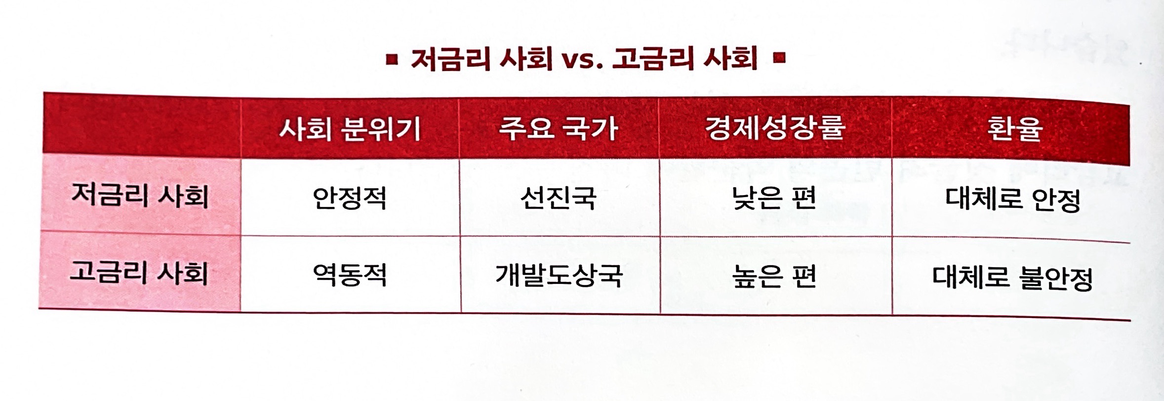 여기 나와 있는 나라들 외에, 우리가 주변에서 볼 수 있는 다른 나라들은 과연 고금리 사회와 저금리 사회 중 어느 곳에 속할까요? 우리나라를 기준으로 보면, 이전에는 고금리 사회에서 역동적인 사회 분위기와 불안정한 환율을 겪었습니다. 높은 경제 성장률을 보이다 비로소 현대에 들어서 저금리 사회에서 안정적인 사회 분위기에 안착했습니다. 우리나라의 발전 여부는 금리를 통해서도 증명된다는 것이죠.