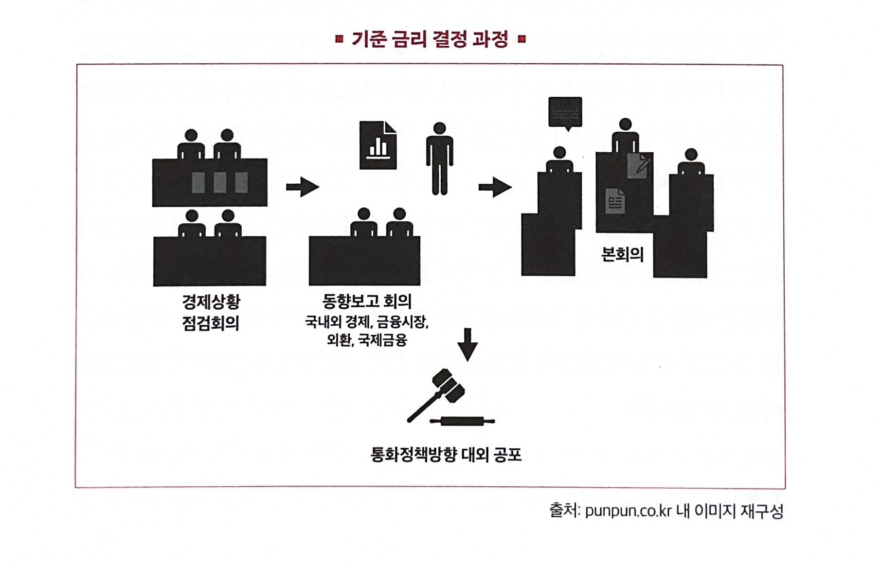 이 기준 금리는 한국은행에서 그냥 결정하는 게 아닙니다. 금융통화위원회라고 해서 우리나라 금융경제 전문가들이 모여 결정을 하는 것이지요. 위원들이 의논해서 기준 금리를 상승과 하강을 결정합니다. 기준금리를 결정하는 요소로는 경기와 물가 등락 여부 등이 있습니다. 한국은행의 역할이 물가관리와 통화정책에 있기 때문입니다.