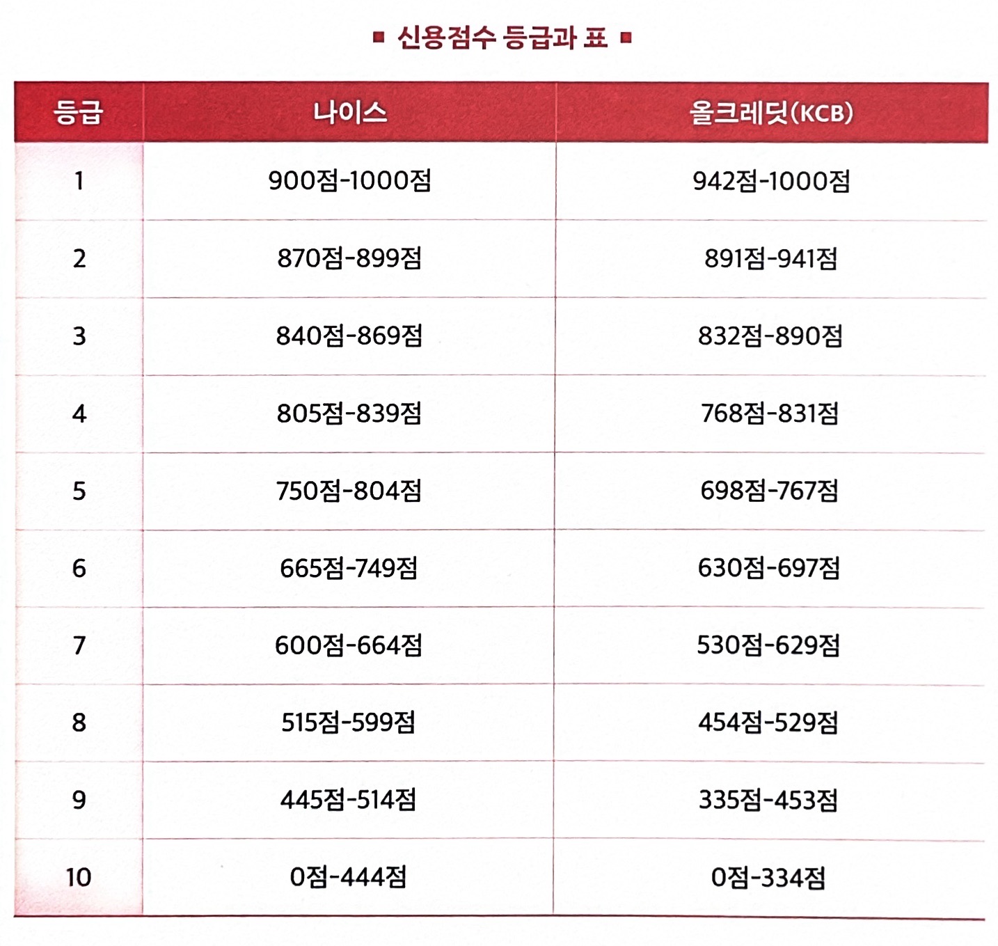 이 신용점수는 민간 신용평가사(나이스, 올크레딧 (KCB))에서 환산합니다. 주된 평가 기준은 대출 여부와 상환의 성실성입니다. 0점부터 1,000점으로 구분되어 있고, 2020년까지는 이 점수를 기준으로 1등급부터 10등급까지 나눠놓았습니다. 이후 2021, 점수제로 아래와 같이 새롭게 구분방식이 바뀌었습니다.
